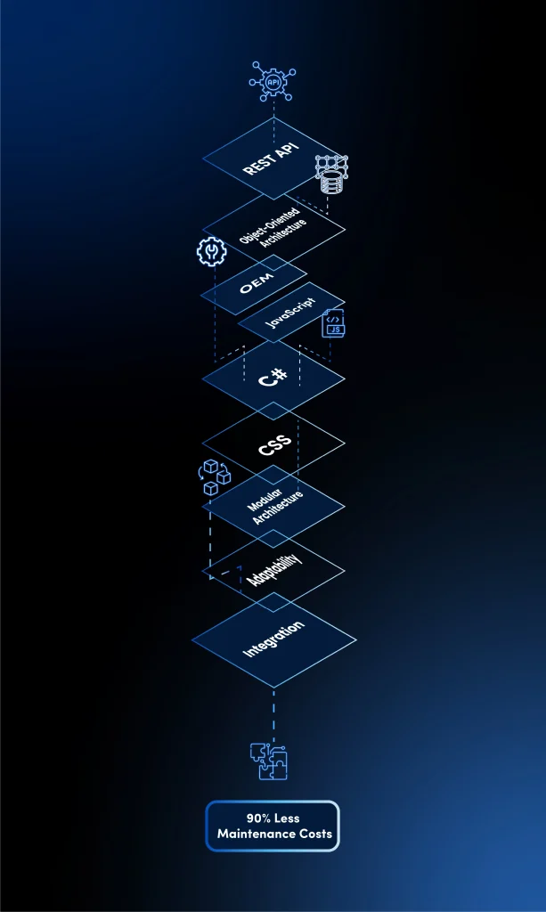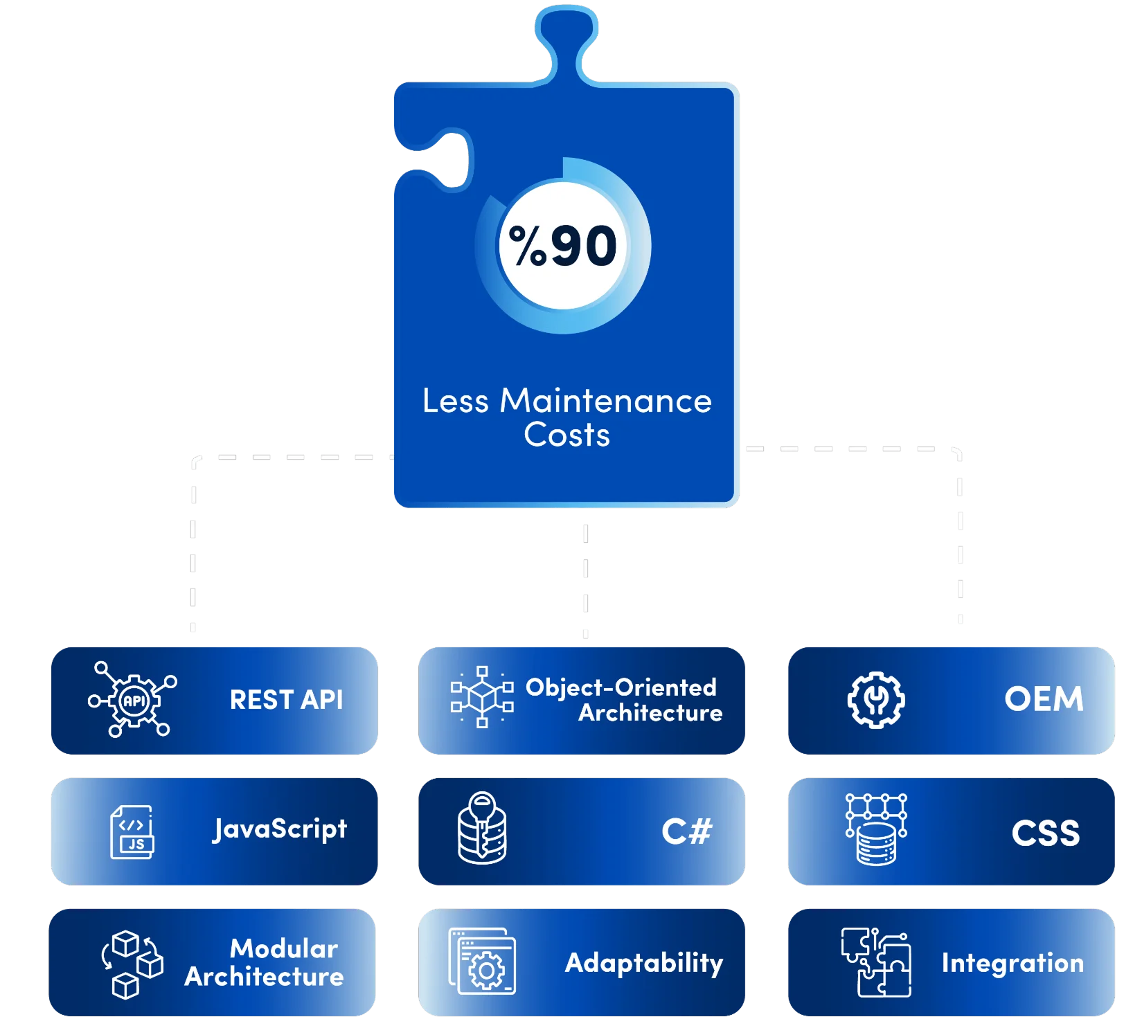 JavaScript, C#, CSS supported custom components can be developed. Thanks to the use of the code library, there is no need to modify existing modules to add new features, only additional components are defined.
