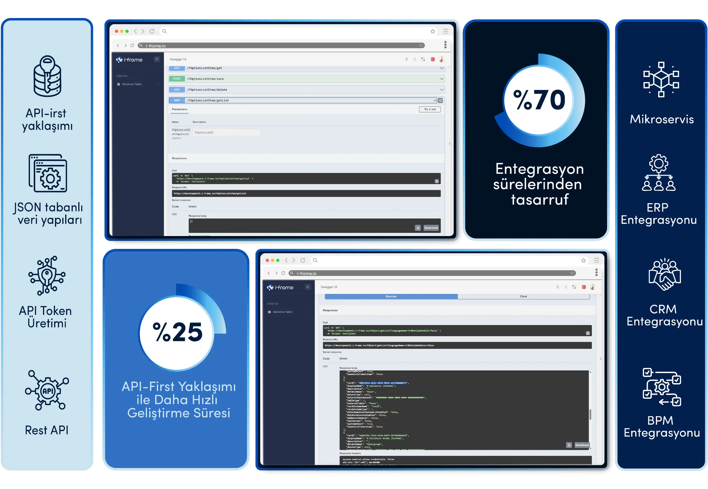 i-frame, platform mimarisinin merkezine REST API-first yaklaşımını yerleştirir. Tüm işlevler—form yönetimi, süreç tetikleme, veri aktarımı ve raporlama dahil olmak üzere—REST API’ler üzerinden erişilebilir. Böylece: