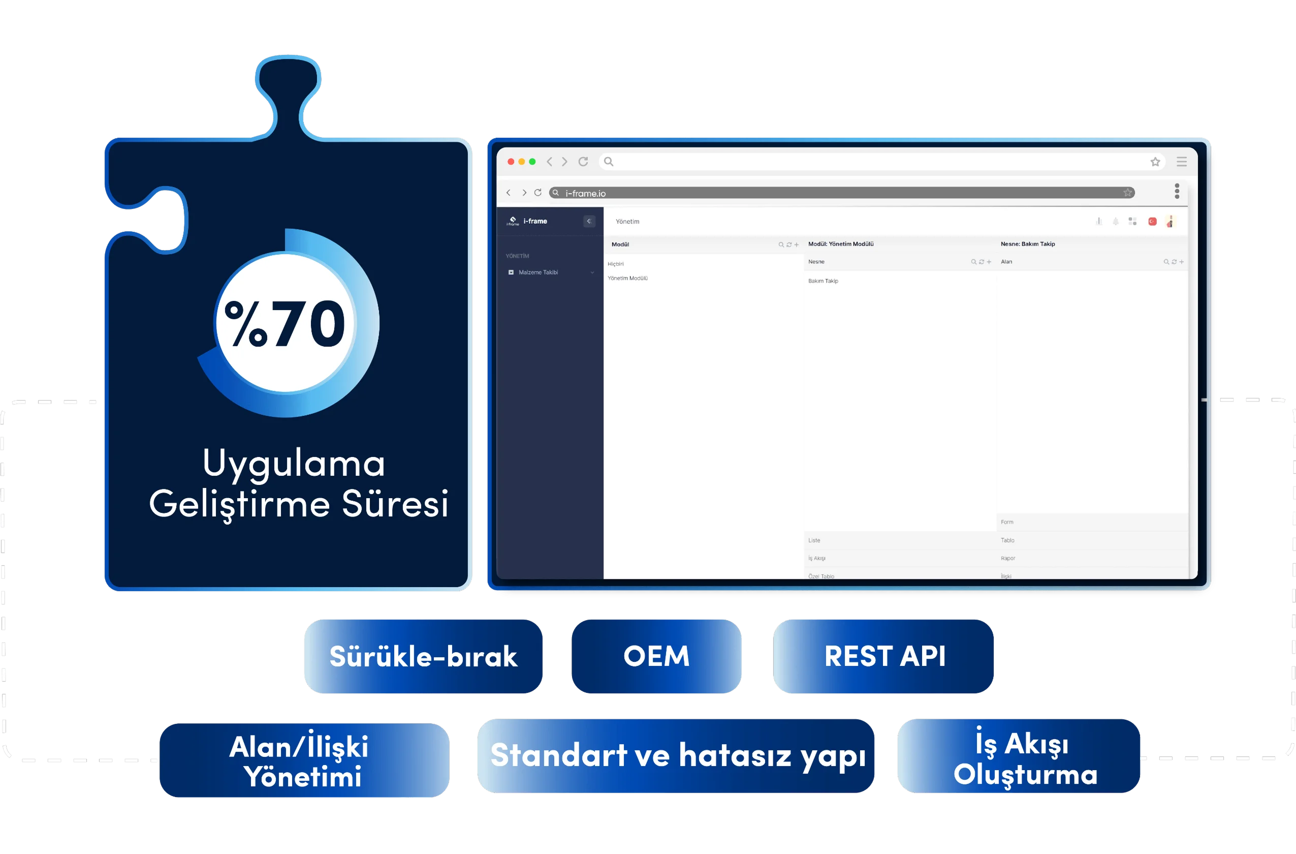 i-frame’in Kolay Yönetim modülü, bir platformun omurgasını oluşturan tüm varlıkları (modül, form, alan, süreç, ilişki, liste, filtre, validasyon, bildirim vb.) tek bir noktadan tanımlama ve yönetme olanağı sunar.