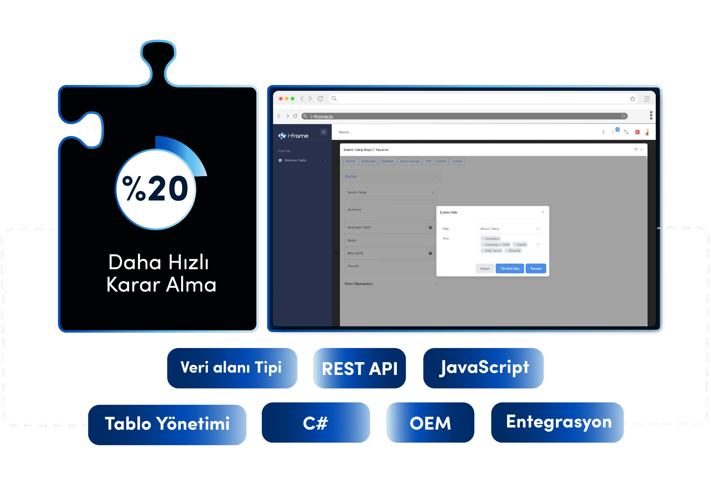 | Veri Alanları | Kodla manuel tanımlanır | 20+ hazır alan tipi, dinamik doğrulamalar |